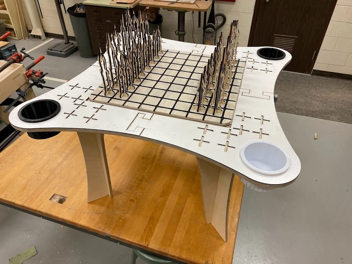 This table I designed is a project that I like a lot, because it’s one of the only times I’ve been able to make a project that takes up a large amount of space. Most of what I’d done up to that point had all been scaled down or digital. I’ve always enjoyed playing chess since I learned from my father, so when the time came to make a game table, I leapt at the chance to be able to make a chess table.