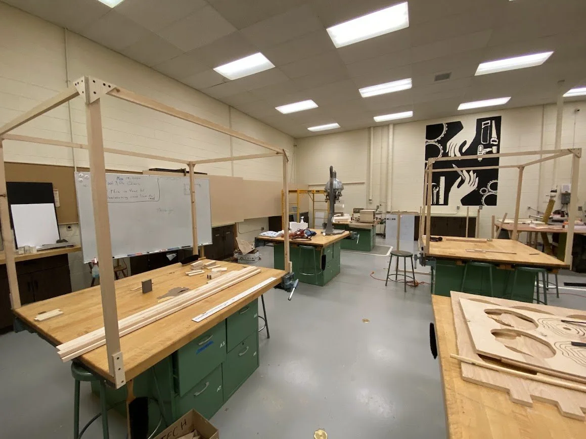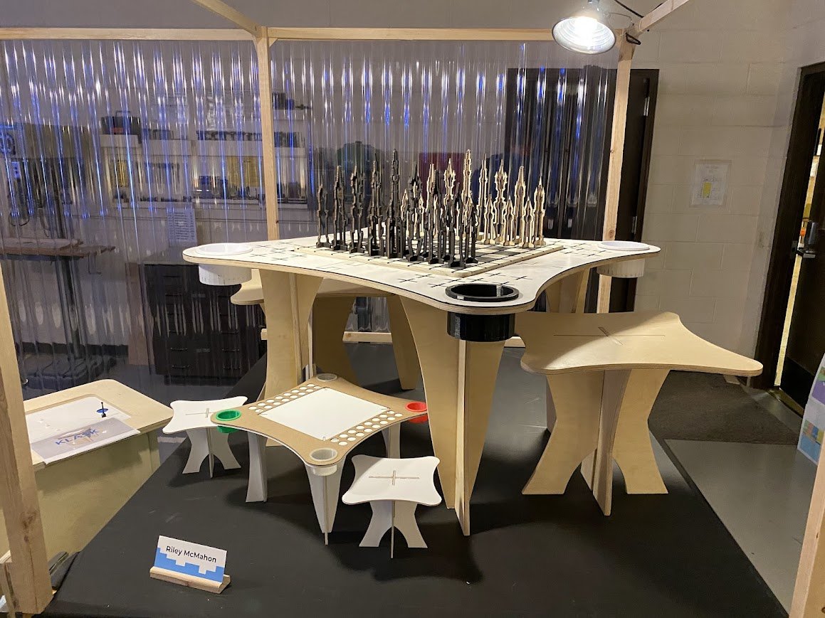 This collaborative display was a unique challenge because it only featured a wall on one side; the other three sides were completely open to maximize the viewability of the project being shown, which was the differences between the scale model and full-size version of my chess table. Another challenge was getting the display lights into the proper position to light the projects being shown.