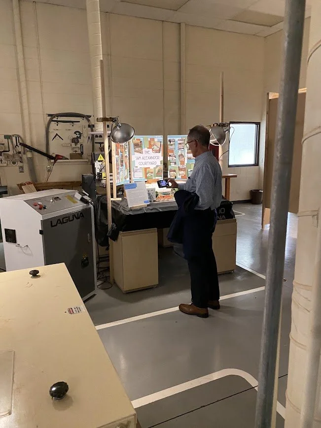 In order to keep my model protected before my presentation, I covered it in a large tarp to keep dust and any other stray particles or debris off of it. As a bit of reassurance, I managed to snag a picture of the current university president taking a picture of the model, which was quite a good confidence booster when it came to giving my presentation the week after this show.