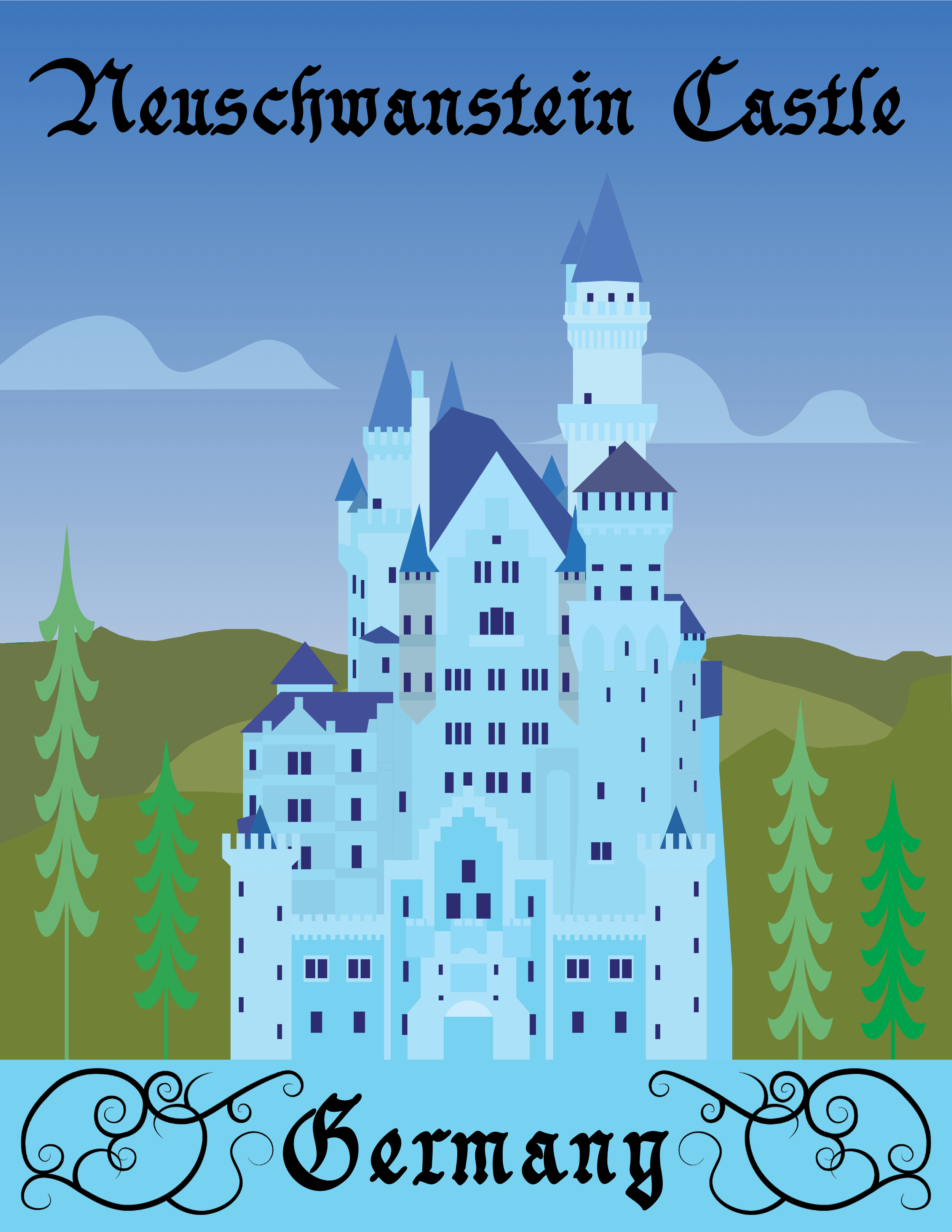 As an avid world traveller, I was very excited when I got the chance to create a poster set of some popular tourist destinations in Bavaria, Germany. The goal here was to use simple shapes and colors to advertise the chosen destinations (those being Neuschwanstein Castle and the Bavarian Alps). A key aspect of this project is that the posters needed to match one another, but not feel like they were a part of the same image. I also made sure to keep the number of different colors low, opting to use 2 or 3 main colors and then various shades and hues that originated from those main colors.