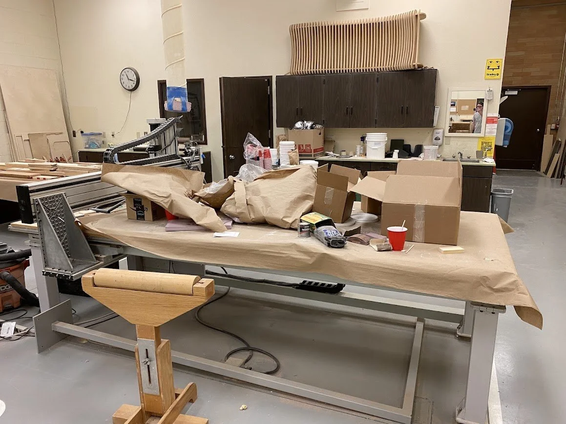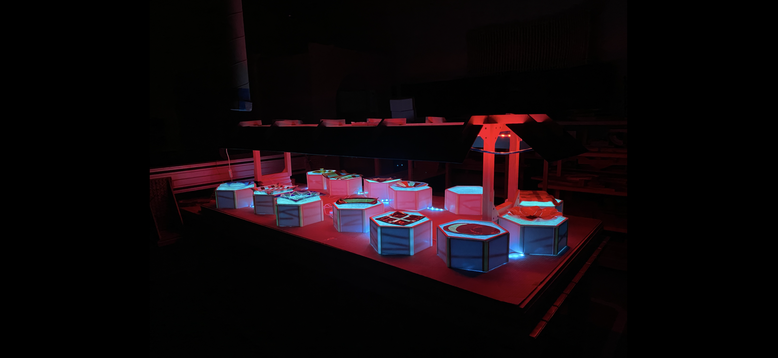 The first thing I had to do was clean off the space the display needed to go, which was on top of an old CNC machine that had become storage for various projects throughout the school year. I then had to develop a way to display all of the glass pieces with light, without the light being the focus of the display itself. I created these hollow hexagonal bases with acrylic tops that would allow the light to shine up through the glass pieces. I synced up all of the display boxes so I could control them all with one command, and I also added some lighting from the top frame to really draw the focus to the glass pieces.